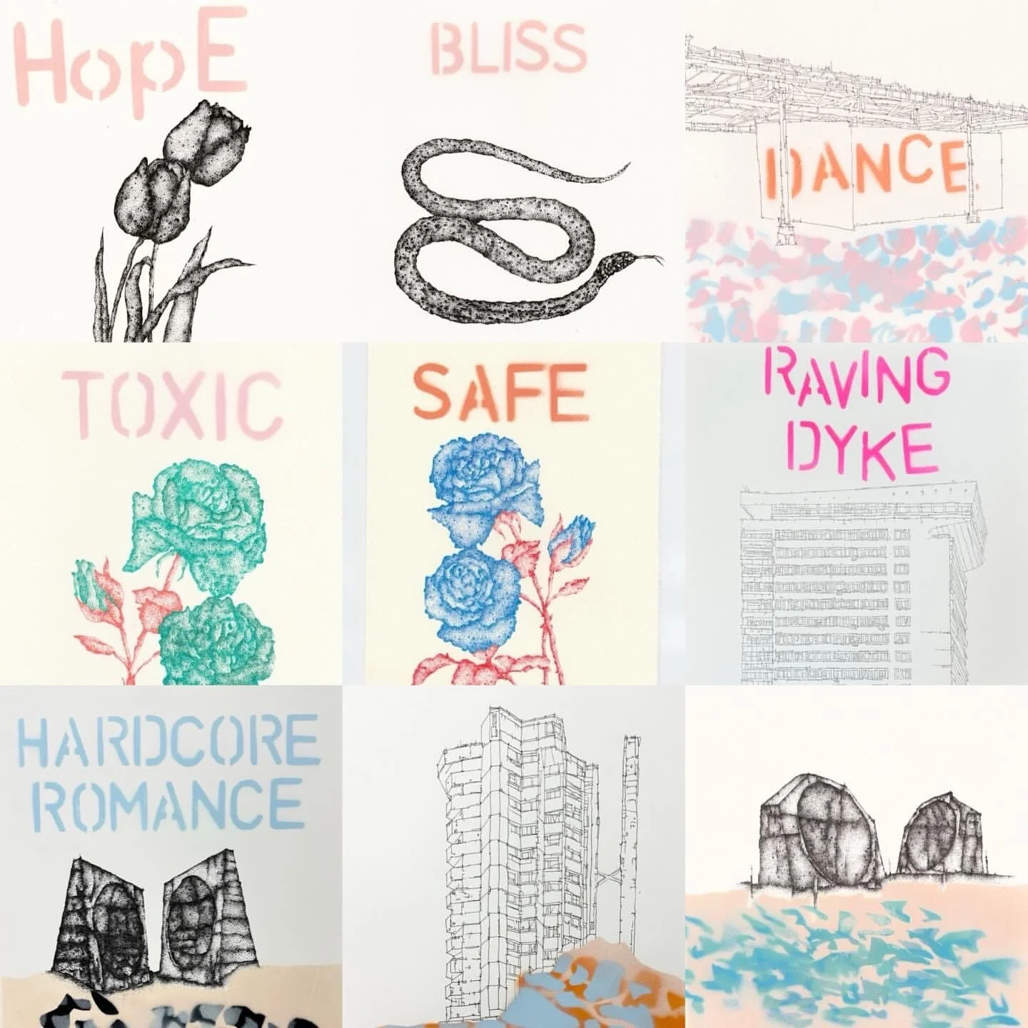 Remaining cards for sale. Hand drawn and spray painted stencils, A5 size, archival inks, spray paint on paper. £10 & £3.50 plus £1.99 postage and packaging.